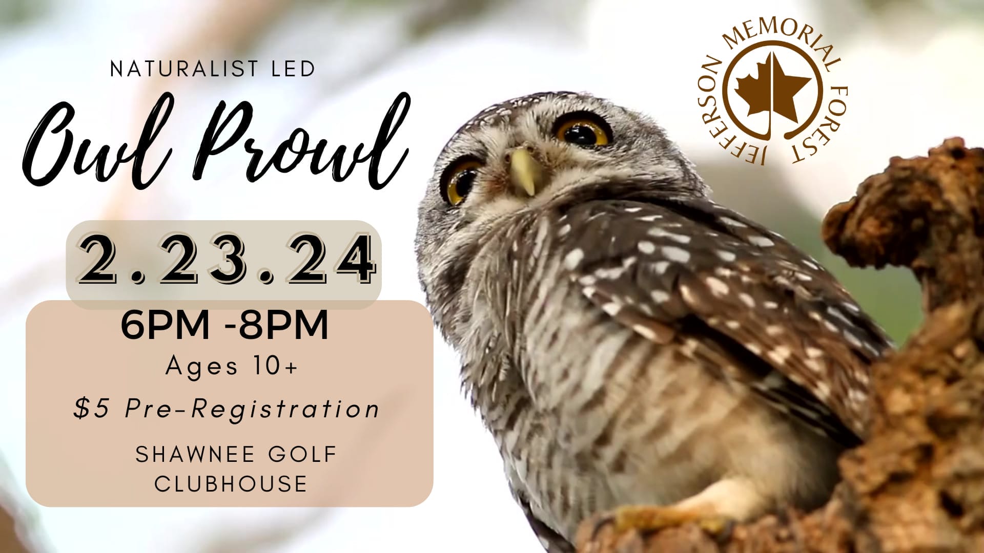 Shawnee Golf Clubhouse 460 Northwestern Parkway, LouisvilleWill owls respond if they’re called? Whooooo knows! Join Natural Areas staff for an owl prowl that will begin indoors with a presentation by Raptor Rehab of Kentuckiana. See live owls up close! Learn about these amazing nocturnal predators, their habitats, and behaviors. The evening continues with a hike along well-traveled paths as we call out for these elusive birds. Dress for the weather. Program meets at Shawnee Golf Clubhouse at 460 Northwestern Parkway, Louisville, KY Fee: $5/person For ages 10 and older A parent/ legal guardian must accompany anyone under the age of 18. Pre-Registration required. Register online or by calling 502-368-5404.
