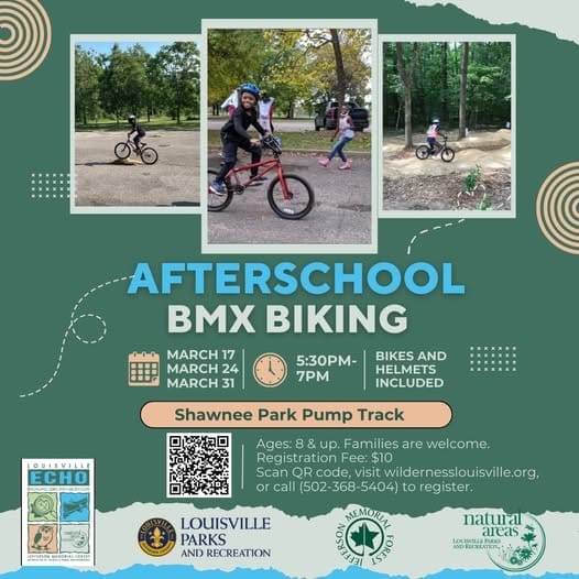 Ever wanted to try BMX biking or Mountain Biking? Bring the family out to Shawnee Park to learn safe biking instruction and how to ride on the Pump Bike Track! Multiple size varieties of Tony Hawk bikes and helmets will be provided. Prior experience of riding a bike is advised to participate. Participants will first get to practice on an obstacle course to build maneuvering skills, and if ready, can progress to the Pump Track loop with supervision from instructors. Feel free to attend all 3 sessions to build up your skills! Program Meets at the Shawnee Park Pump Track near the ECHO office. Ages: Ages 6 and up for the obstacle course and ages 8 and up for the pump track. Maximum participant age is 18. Families and parents are welcome to join to assist their child. Register online:https://tinyurl.com/26fcwvwh or by calling 502-368-5404. Fee: $10 per session
