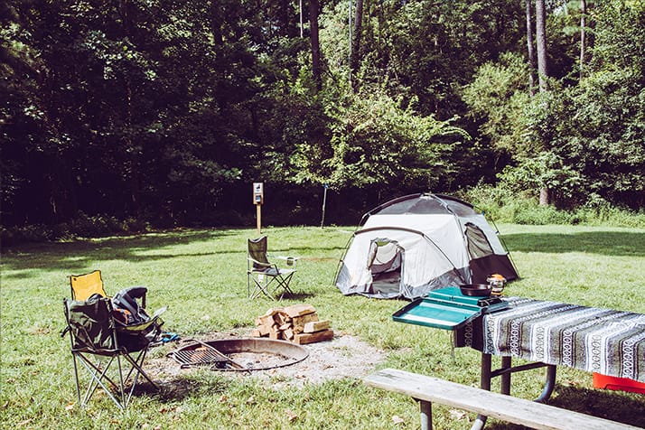 All sites have picnic tables, fire ring, and parking for two vehicles per site. Group Site #2 is a grassy area surrounded by hardwood forest and offers water and two medium picnic tables.